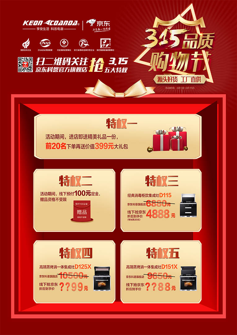 集成灶十大品牌、廚電行業十大品牌科恩電器315品質購物節,3月1日至3月15日活動期間,關注京東科恩官方旗艦店搶3.15五大特權!特權一:凡進店客戶,即送精美禮品一份,前20名下單再送價值399元大禮包;特權二:活動期間線下預付100元定金,贈品資格將不受限;特權三:經典消毒柜款集成灶D115京東科恩旗艦店6880元,線下搶京東折后到手價4888元;特權四:高端蒸烤消一體集成灶D125X、D151X線下搶京東折后到手價低到你不能想象!