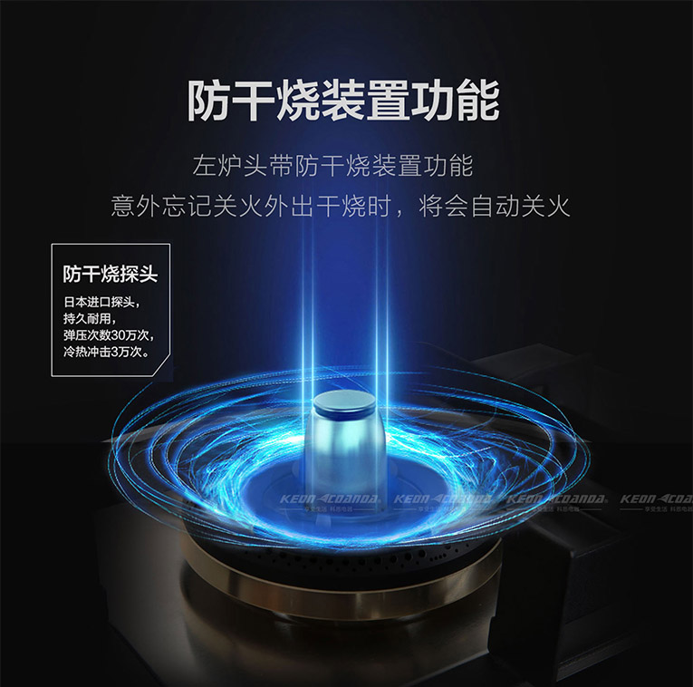 一臺好的灶具,安全保障不能忘!能擁有一臺安全安全系數高,品質又可靠的灶具那是再好不過了,集成灶十大品牌、廚電行業十大品牌科恩電器嚴把質量關,在安全防護上下足功夫,KN610智能防干燒灶具擁有熄火保護、童鎖保護等。另外最大安全防護在于它擁有防干燒裝置,日本進口探頭,意外忘記關火、離鍋60S時將會自動關火,可靠防護,使用無憂!