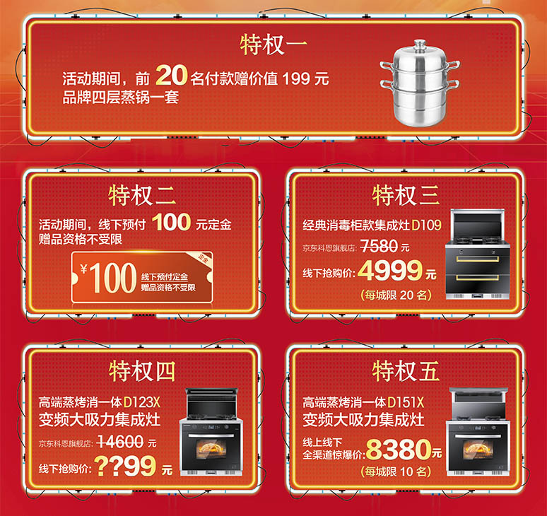 科恩電器一直倡導“樂享智慧烹飪”,本次活動也將以“集成智慧廚房”為宗旨,將活動產品鎖定與高端產品上。據悉,本次集成灶十大品牌、廚電行業十大品牌科恩電器攜手京東商城五一狂歡活動,只為讓一直以來支持科恩電器的消費者花最少的錢購到心儀的集成灶,五大特權優惠、搶名額、搶補貼,超劃算的活動肯定讓你心動。