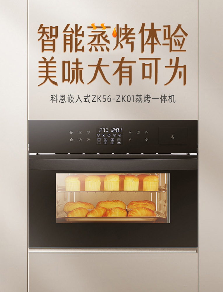 集成灶十大品牌、廚電行業十大品牌科恩ZK01蒸烤一體機帶給消費者不僅僅是生活上的享受也是精神上的富足,帶給了用戶全新的使用體驗,滿足多種烹飪需求,又不會占用太多空間的蒸烤一體機成了熱門選擇。科恩ZK01蒸烤一體機囊括蒸和烤兩大要素,集多種功能于一身,燒烤、蒸菜、發酵、加熱、解凍、烘焙統統不在話下,大顯各式蒸烤廚藝,八大模式蒸烤合璧,大蒸汽360°迅速包裹食材,三大溫域蒸制模式,智能匹配不同食材適宜溫度,立體加熱均勻烤,五種模式美味盡攬,快燒烤、風扇烤、烘焙烤、風焙烤、加濕烤,360°熱風循環烘焙系統,在家探索更多烘焙新花樣,精準控溫,烘烤溫度更準確,食材色澤口感更佳!