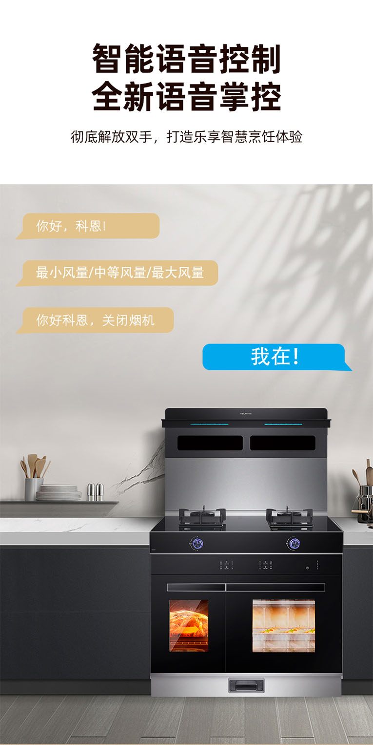 另外,集成灶十大品牌、廚電行業十大品牌科恩S450左右蒸烤集成灶還擁有智能語音控制,“你好科恩!最小風量/最大風量/最大風量;你好科恩!關閉煙機”,全新語音掌控徹底解放雙手。智能變頻巡航20m3/min低空近吸,低空封鎖油煙升騰區,吸凈雙灶爆炒煙,杜絕油煙倒灌,遇堵排煙強效節能,高樓排煙快!在火力方面,擁有穩定而暢快的火力是非常好的烹飪體驗,小火煲湯、大火爆炒,烹飪出舌尖上不同的美味,科恩S450左右蒸烤集成灶具備5.2kW猛火爆炒,聚能火力加持,火焰更集中,大火小火皆在掌控之間,煎炸蒸炒毫無壓力。