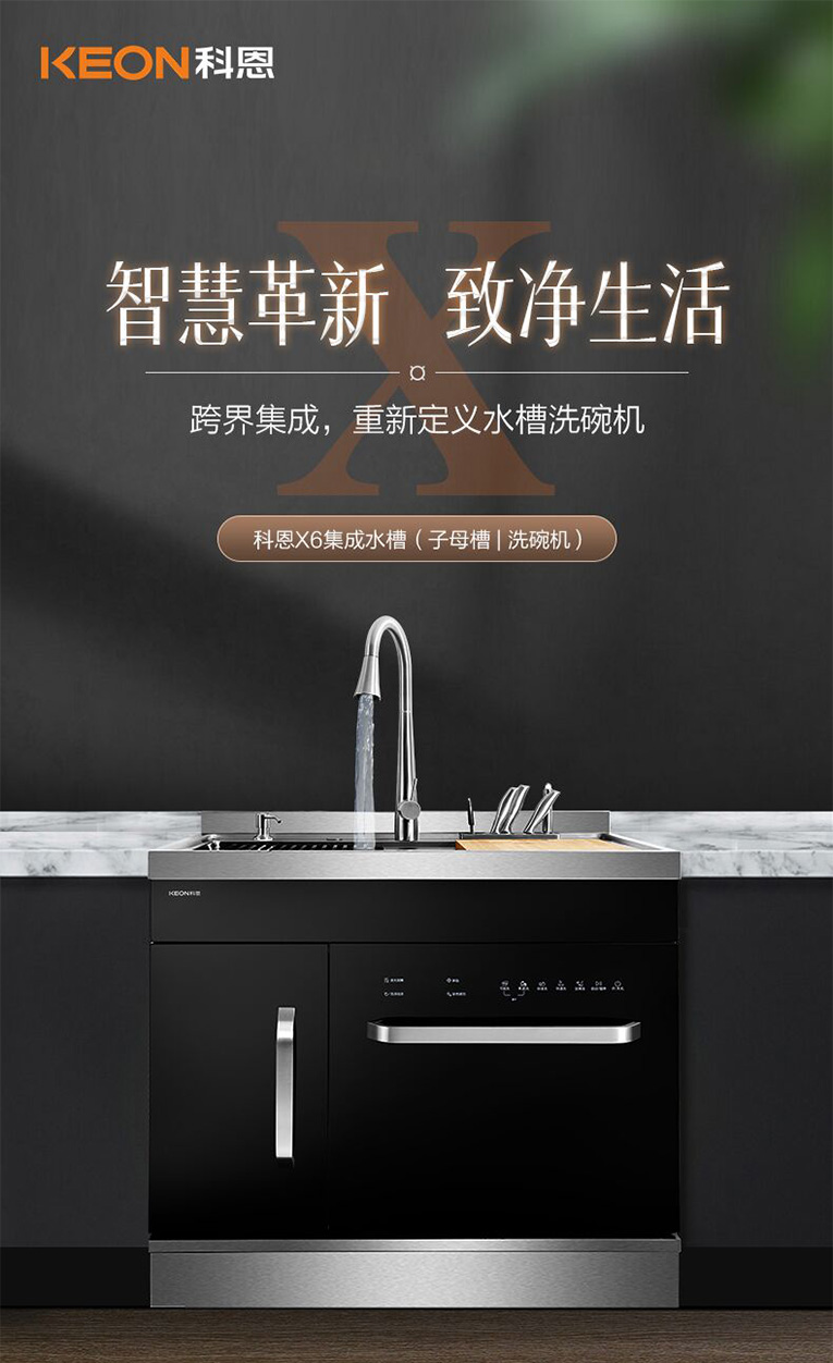 洗滌區集成革命,科恩X6集成水槽解放雙手!寧可燒飯也不洗碗,X6集成水槽核心是將水槽、洗碗機、切菜板、瀝水籃等功能集成一體,解決空間問題,真正做到洗、消、烘、存一體,節約餐后洗碗時間,可以更好的陪伴家人。