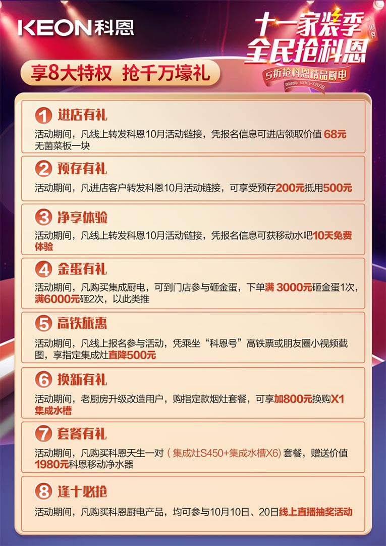 10月1日——10月23日,集成灶十大品牌、廚電行業(yè)十大品牌科恩集成灶“十一家裝季 全民搶科恩”活動(dòng)開啟,終端活動(dòng)玩法升級(jí)、福利加碼,打造金秋十月盛大福利狂歡盛宴,讓更多人能有機(jī)會(huì)享受到科恩集成灶十月活動(dòng)帶來(lái)的福利。進(jìn)店有禮、預(yù)存有禮、凈享體驗(yàn)、金蛋有禮、高鐵旅惠、換新有禮、套餐有禮、逢十必?fù)尯蓝Y巨獻(xiàn)。
