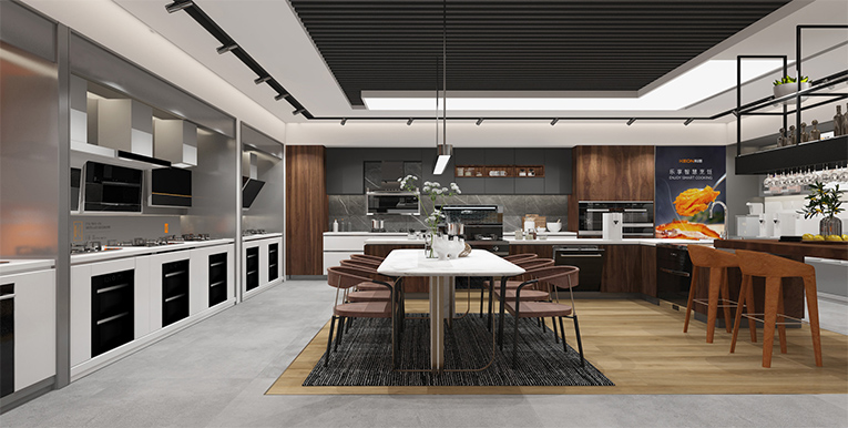 科恩新門店簡約、大氣、精美的視覺沖擊讓人印象深刻,開放式瀏覽路徑,通過“視覺+產(chǎn)品+體驗(yàn)”的融合,以差異化彰顯品牌個(gè)性,讓消費(fèi)者通過感知產(chǎn)品來感受品牌,對多個(gè)區(qū)域進(jìn)行場景重構(gòu),產(chǎn)品陳列區(qū)、廚房場景、品牌背書、洽談區(qū)等,通過模塊化的方式,將核心產(chǎn)品模塊以及開放式廚房體驗(yàn)場景植入門店。