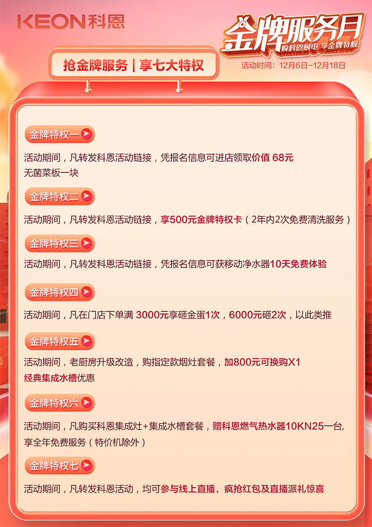 踐行科恩12余年來一直給予消費者的服務承諾,特此元旦新春佳節到來之際,舉辦“金牌服務月”活動,購科恩廚電,享金牌特權,為您的健康廚房保駕護航!科恩“金牌服務月”火熱進行中,七大特權助力活動圓滿成功!