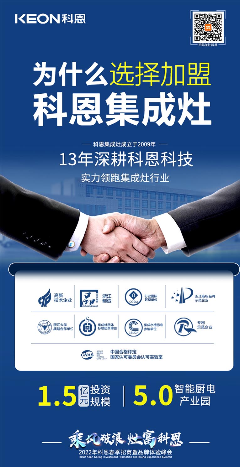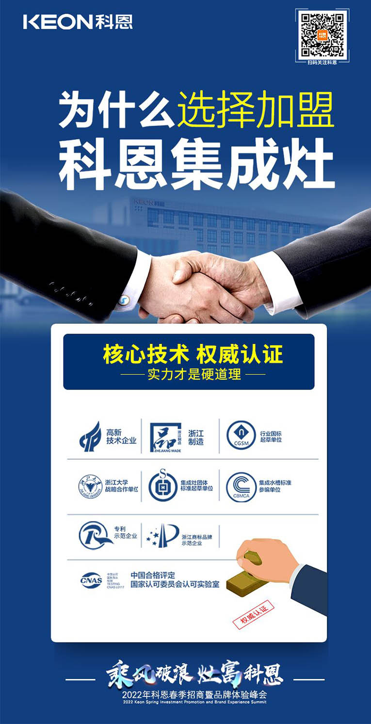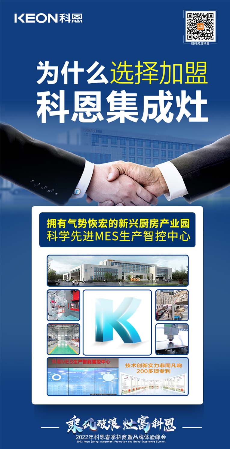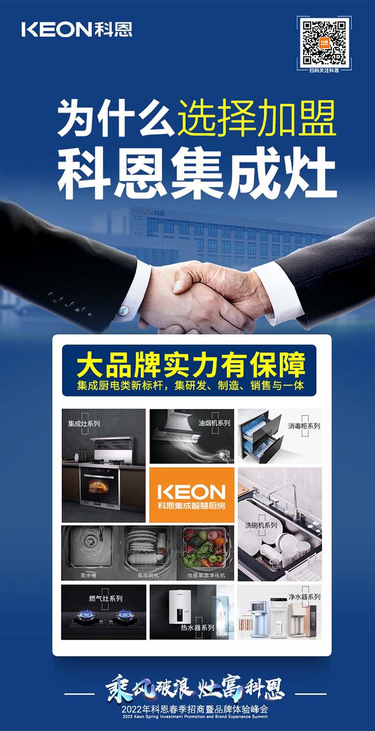 “乘風破浪,灶富科恩”2022科恩春季招商暨品牌體驗峰會將于3月18日舉行,選擇大于努力,抓住時代機遇!集成灶十大品牌、廚電行業十大品牌科恩集成灶具備優于業界的技術、高質量的保證、強大的企業實力、有保障的售后等優勢,實力加盟的不錯之選。