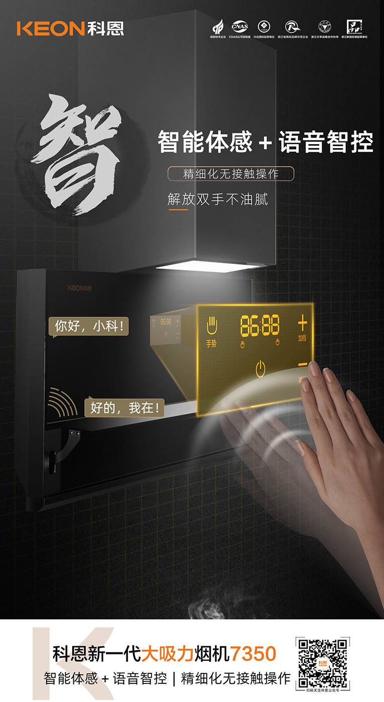 集成灶十大品牌、廚電行業十大品牌科恩新一代大吸力煙機7350還擁有智能語音控制與體感操控,呼喚“你好小科”可控制煙機。