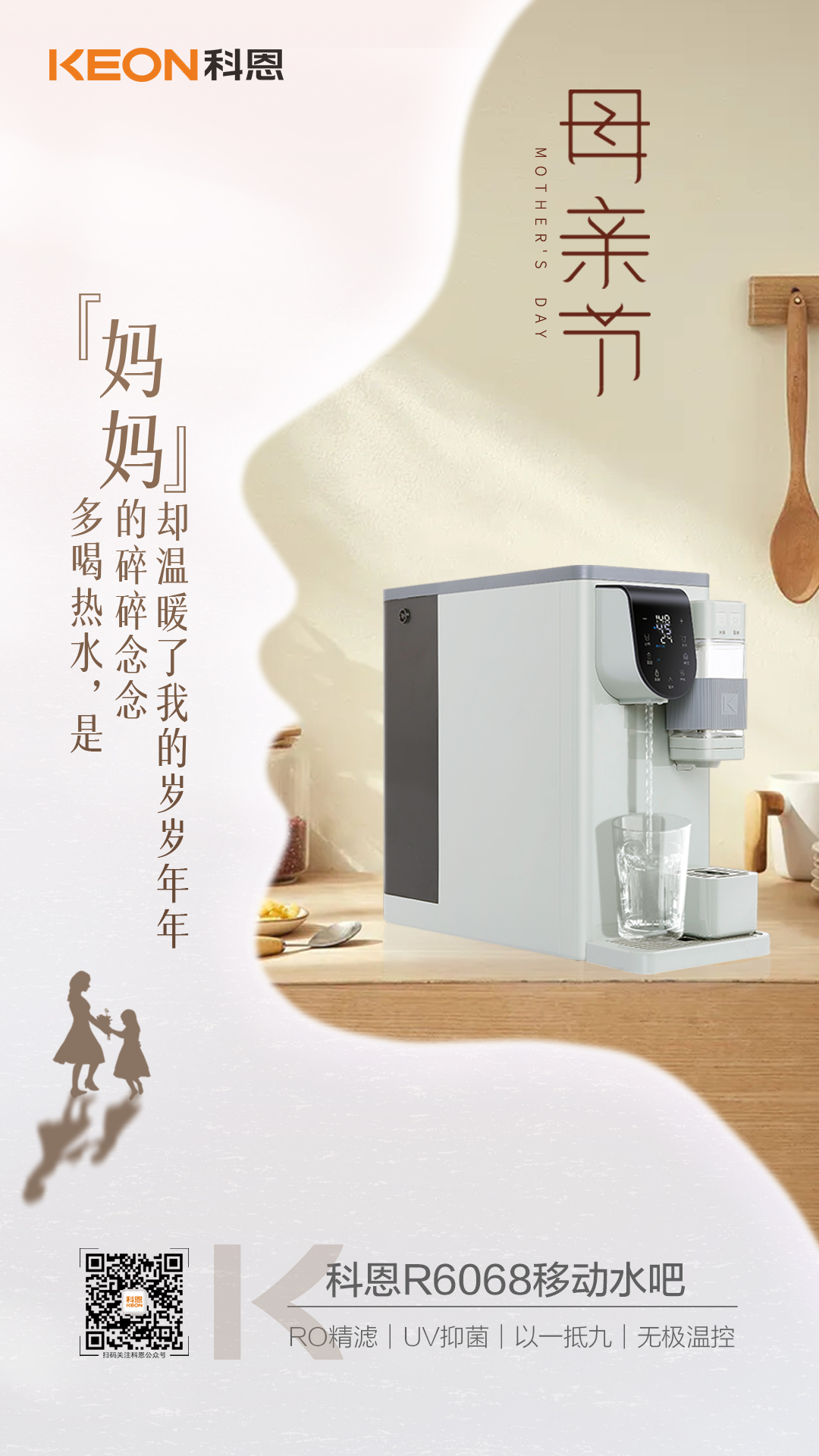 咱家老房水質(zhì)差,長期飲用對身體影響特別不好,給您和爸選了一臺科恩集成式凈水器,體積小,不用安裝,哪都能放,功能可多了:凈水、加熱、調(diào)溫、直飲、溫度和水量都能自由選擇,還有你們最愛的一鍵泡茶功能呢!他的濾芯是0.1納米RO精濾,過濾精度遠超病毒直徑,能有效濾除水中的重金屬、農(nóng)藥、余氯等有害物質(zhì),還能改善水質(zhì)口感,增加對人體有益的礦物質(zhì)!