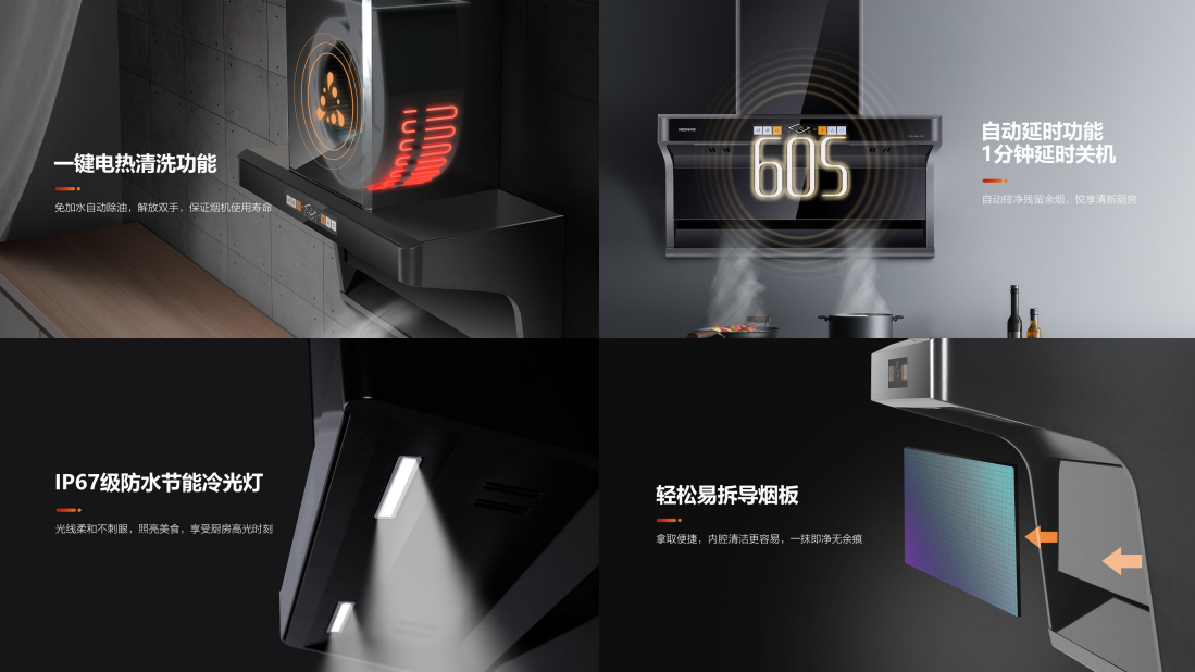 ◆一鍵電熱自清潔功能,自動(dòng)電加熱溶解油污,高速甩干速凈,免加水自動(dòng)除油,解放雙手的同時(shí),更能延長(zhǎng)煙機(jī)的使用壽命、保持大吸力,歷久彌新!