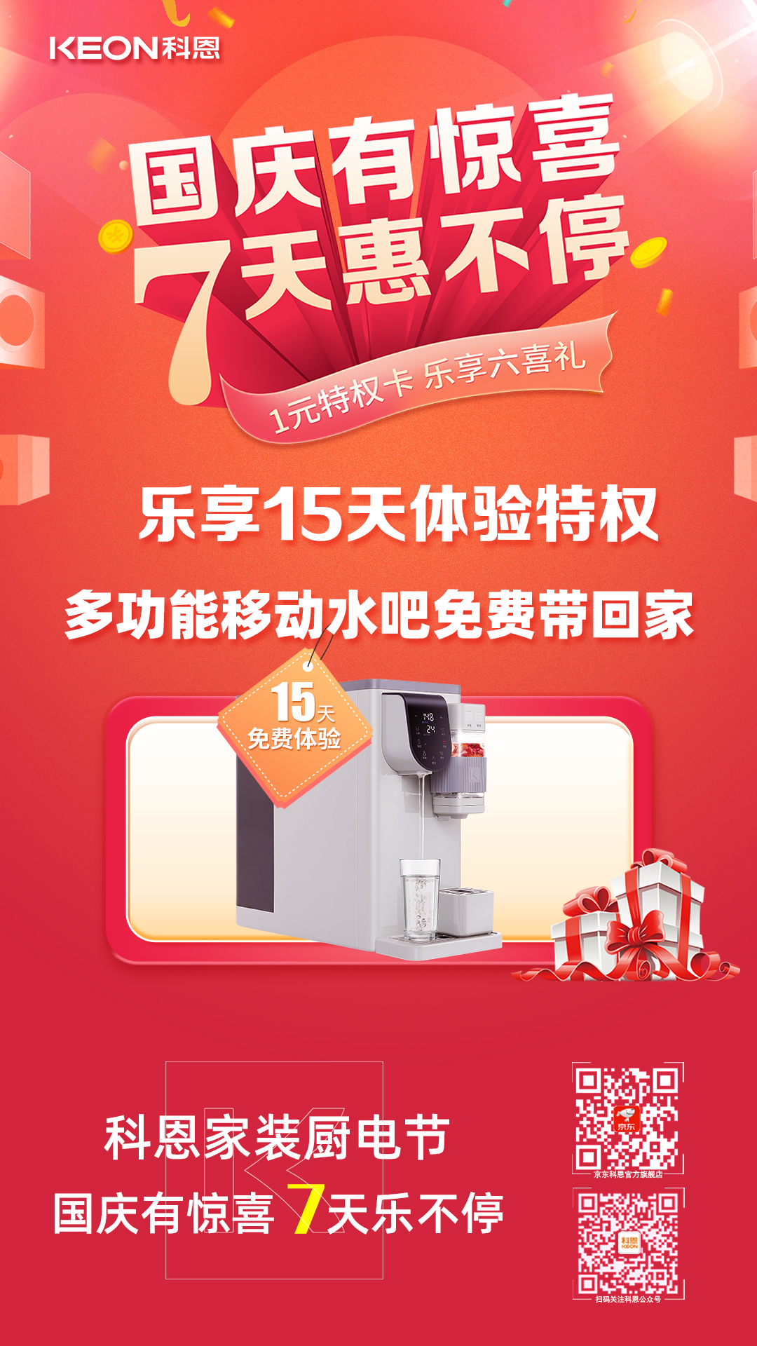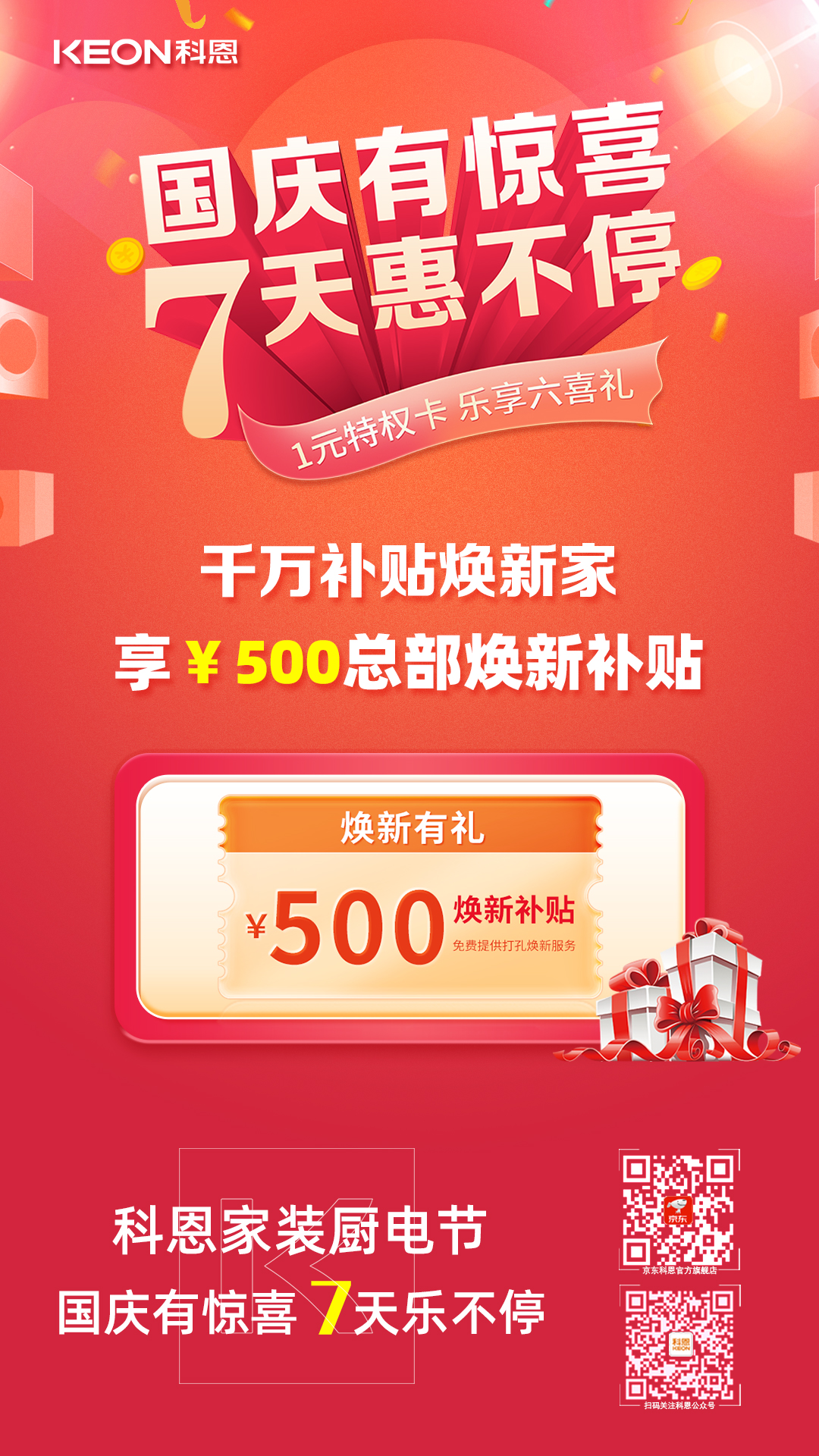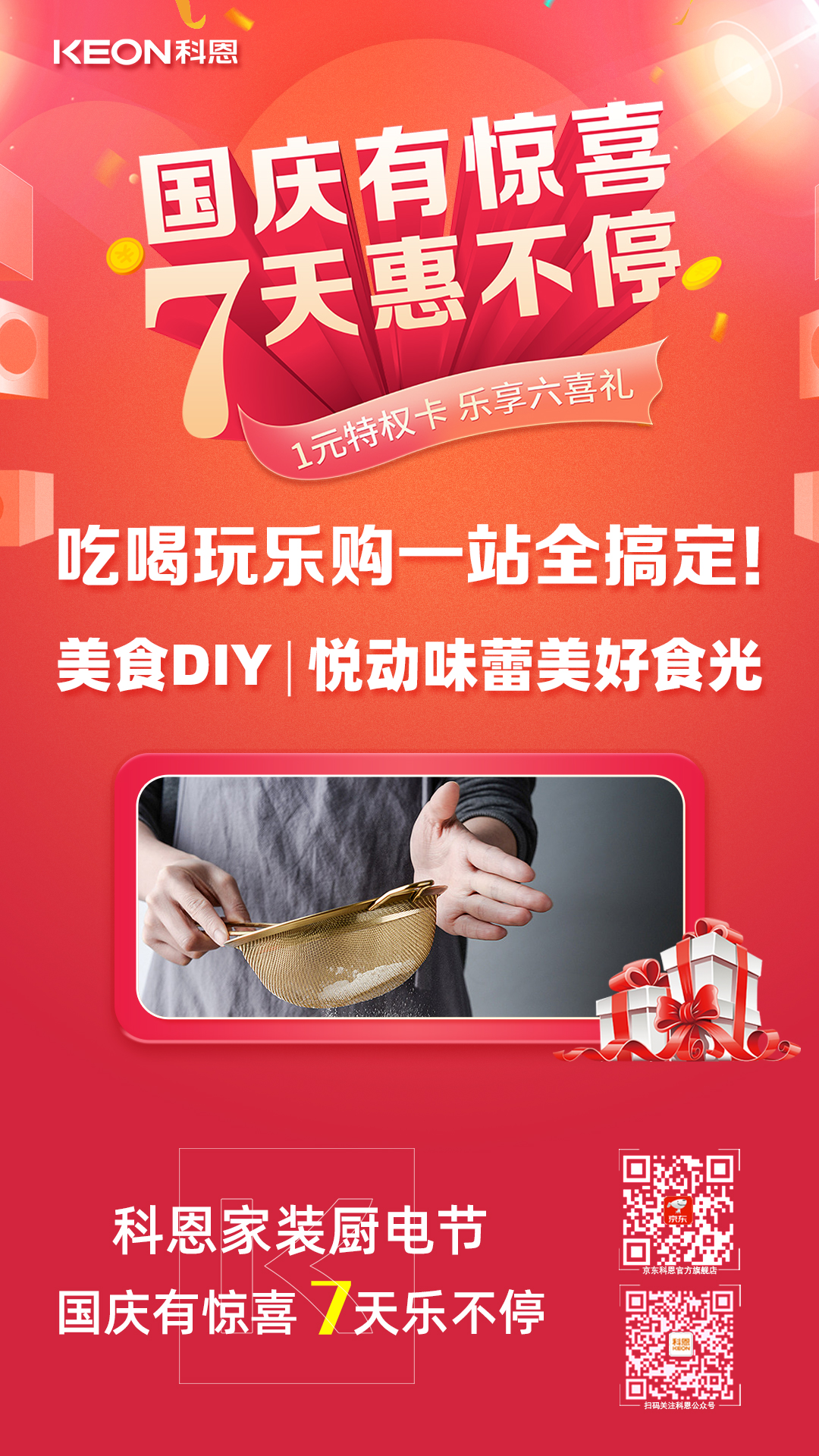 國慶價·提前享,科恩家裝廚電節之國慶專輯——國慶有驚喜,7天惠不停,科恩集成灶帶你嗨購黃金周!