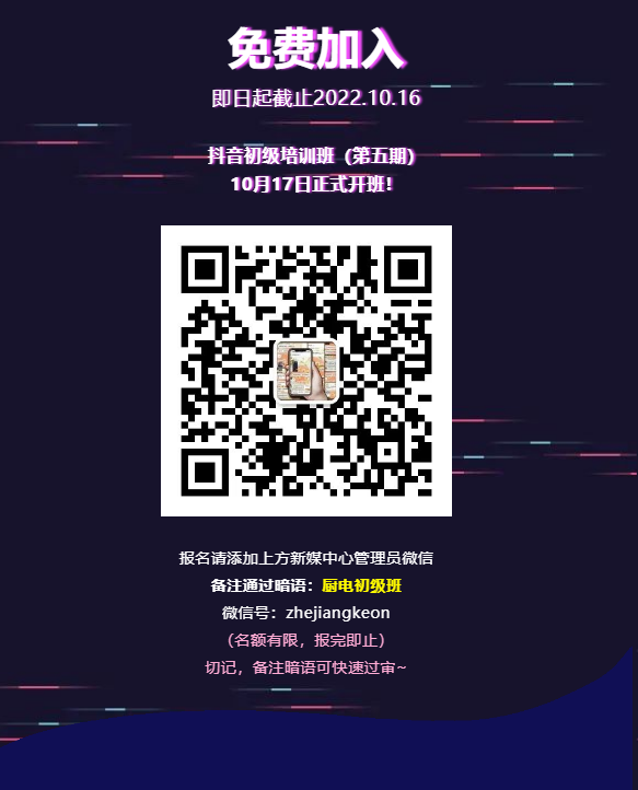 目前,第五期抖音實戰(zhàn)訓練營初級班已全面啟動,欲報從速!歡迎在此留言報名或者添加科恩新媒體官方微信搶占名額!科恩新媒體官方微信:zhejiangkeon