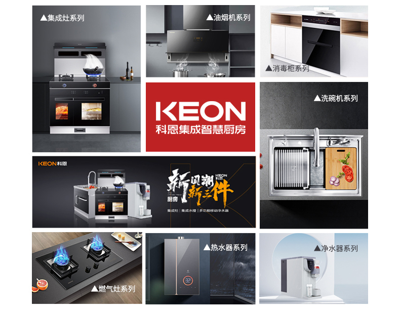 浙江科恩電器有限公司是國家高新技術企業、專利示范企業、集成灶十大品牌、CNAS認可實驗室、高效凈化環保之星、行業國標起草單位、集成灶團體標準起草單位。科恩集成智慧廚房是一家專業生產高檔吸油煙機、燃氣灶、消毒柜、集成環保灶、移動凈水器等一體綜合性廚衛電器企業。