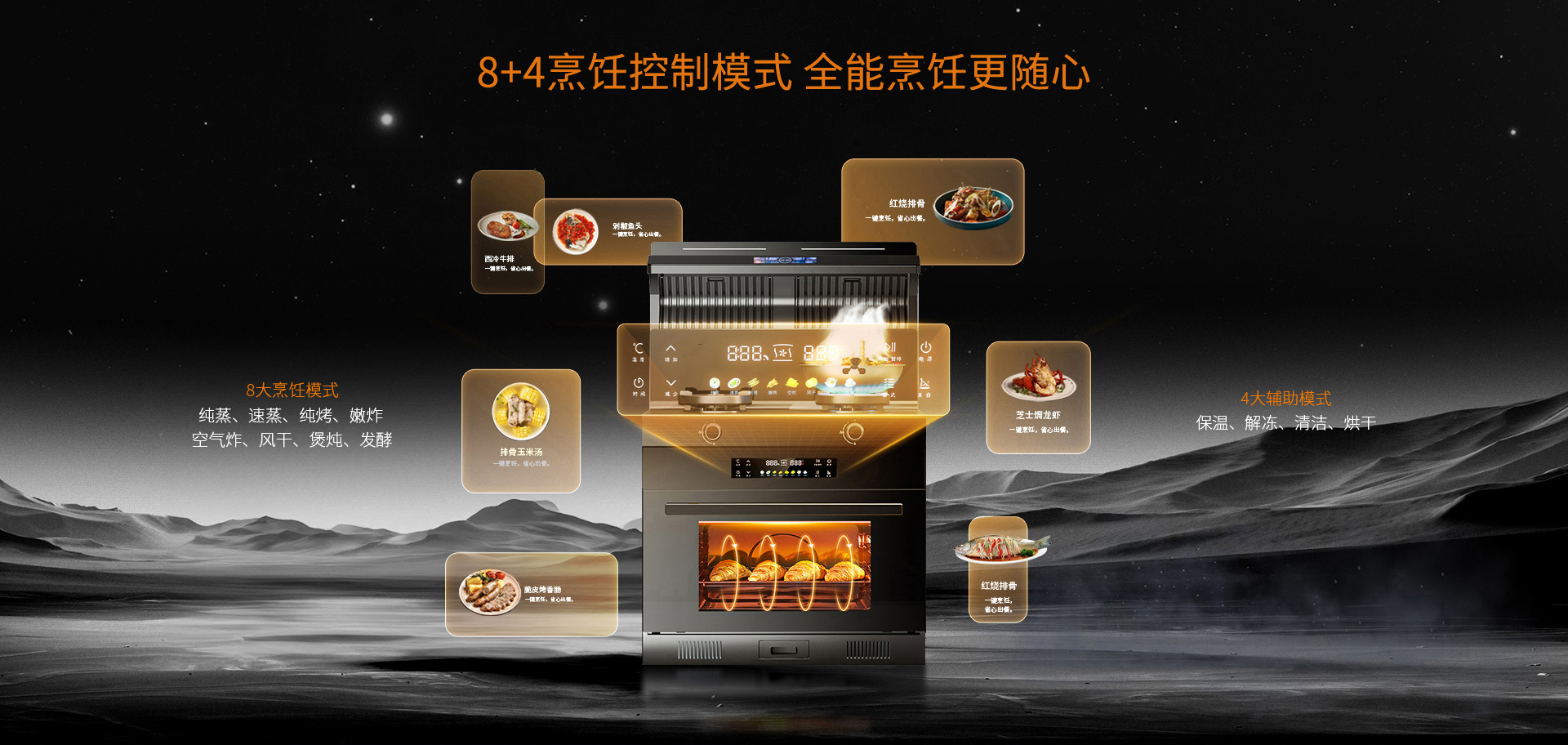 防爆免清洗集成灶標(biāo)配8+4烹飪模式,可滿足純蒸、速蒸、純烤、嫩炸、空氣炸、風(fēng)干、煲燉、發(fā)酵等8大烹飪模式,滿足日常烹飪需求,同時(shí)配置4大輔助模式,可實(shí)現(xiàn)保溫、解凍、清潔、烘干。