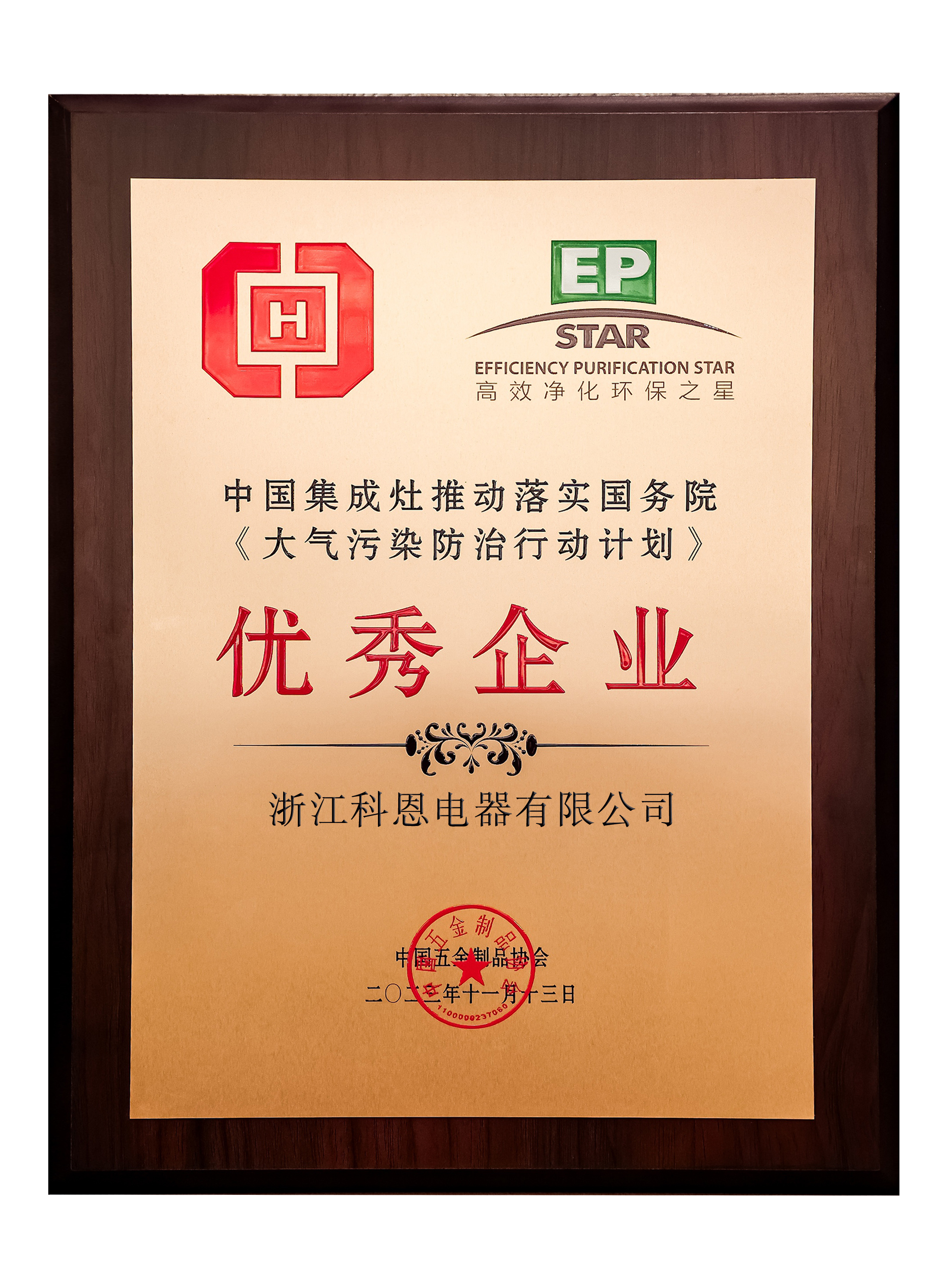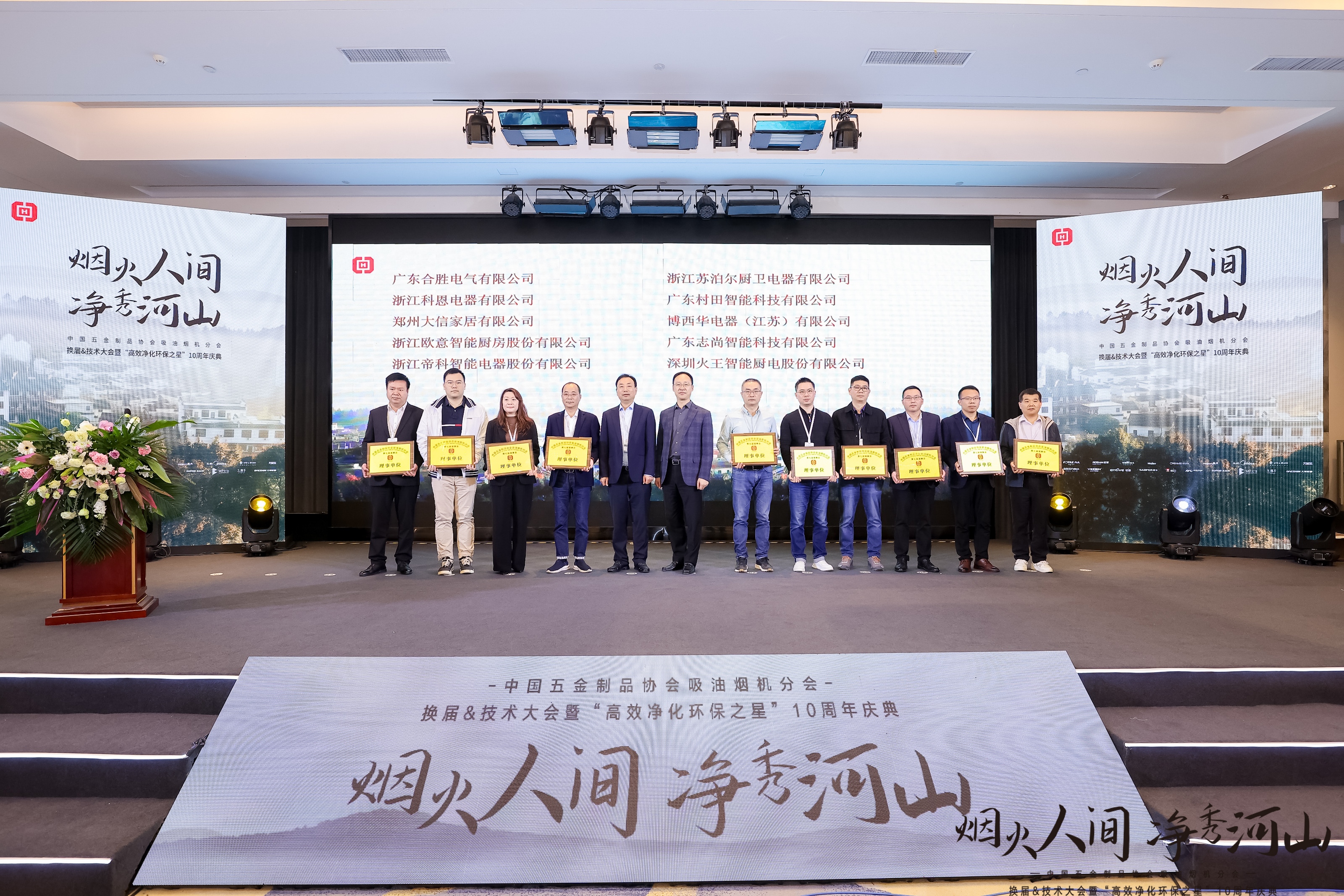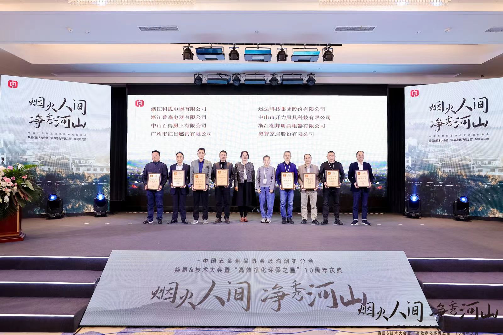 20231128日,主題為煙火人間 凈秀山河有中國五金制品協會召開的“中國五金制品協會吸油煙機分會·換屆&技術大會暨‘高效凈化環保之星’10周年慶典”在杭州隆重舉辦。會上發布了獲得本屆高效凈化環保之星優秀企業,并向多年來連續參與此項目并表現突出的企業給予了嘉獎。科恩再一次榮獲中國五金制品協會-理事單位”及“中國集成灶推動落實國務院《大氣污染防治行動計劃》-優秀企業”!