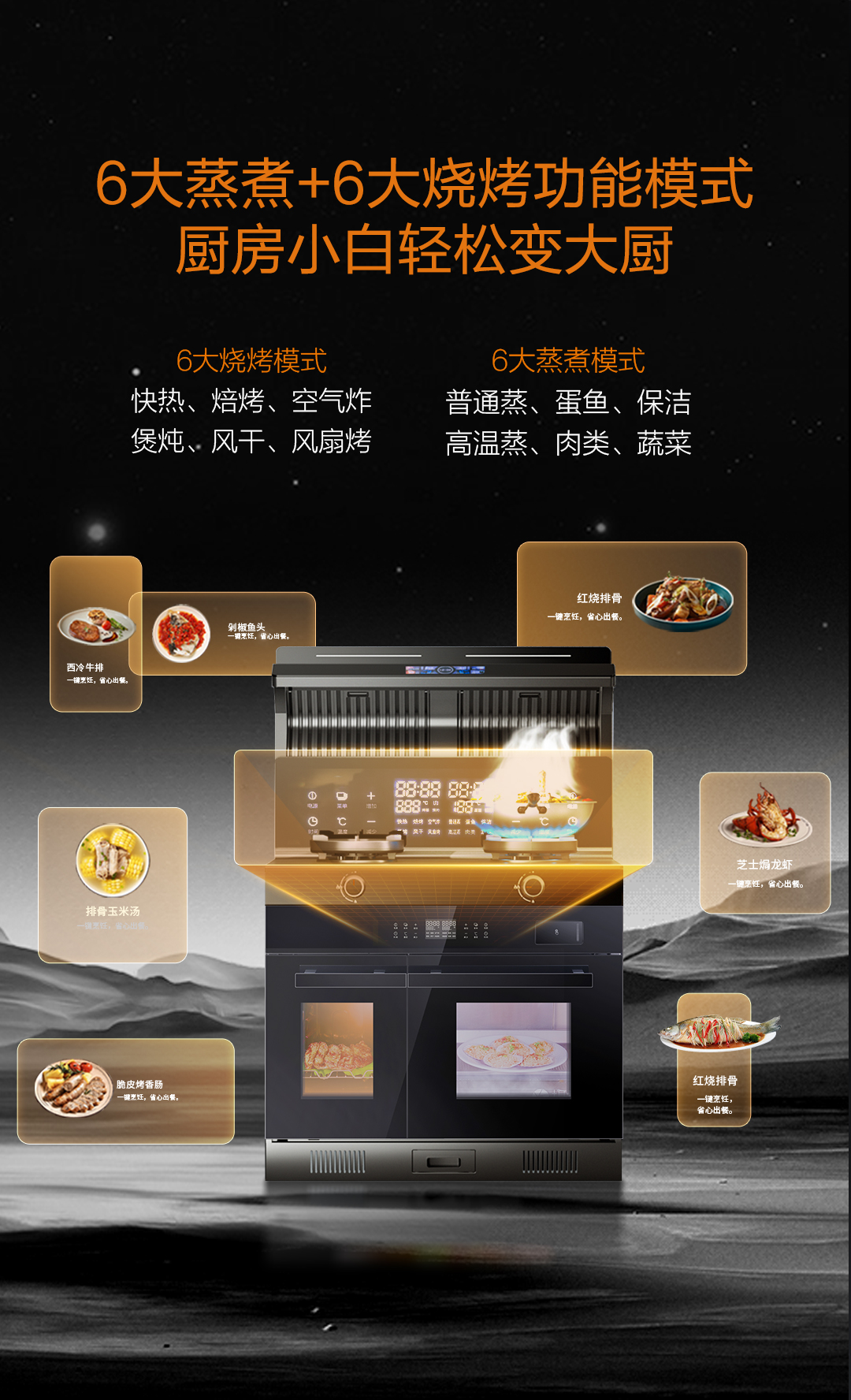 6大蒸煮模式+6大燒烤模式,內置菜譜,一鍵直達,美味可以更簡單。