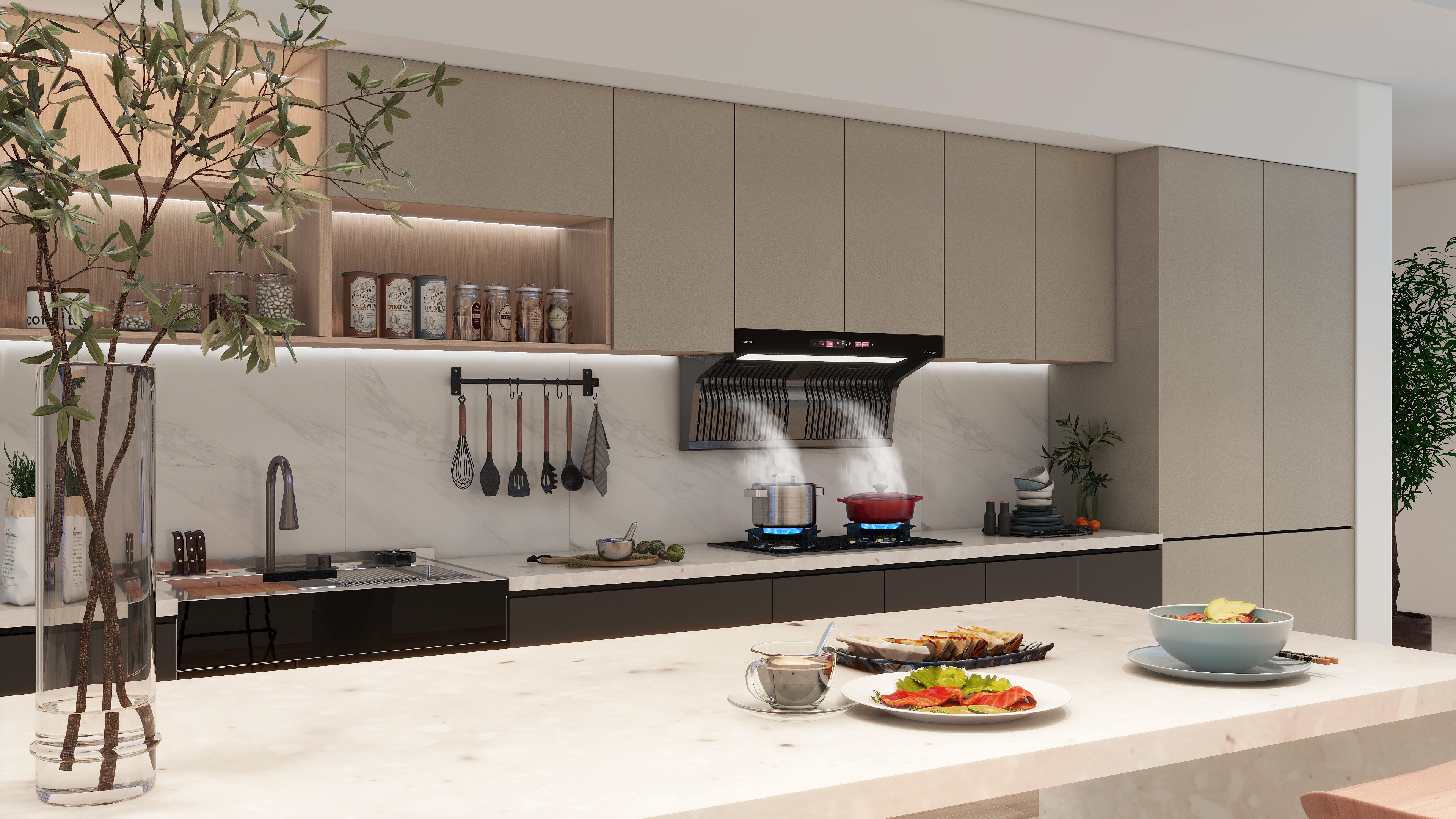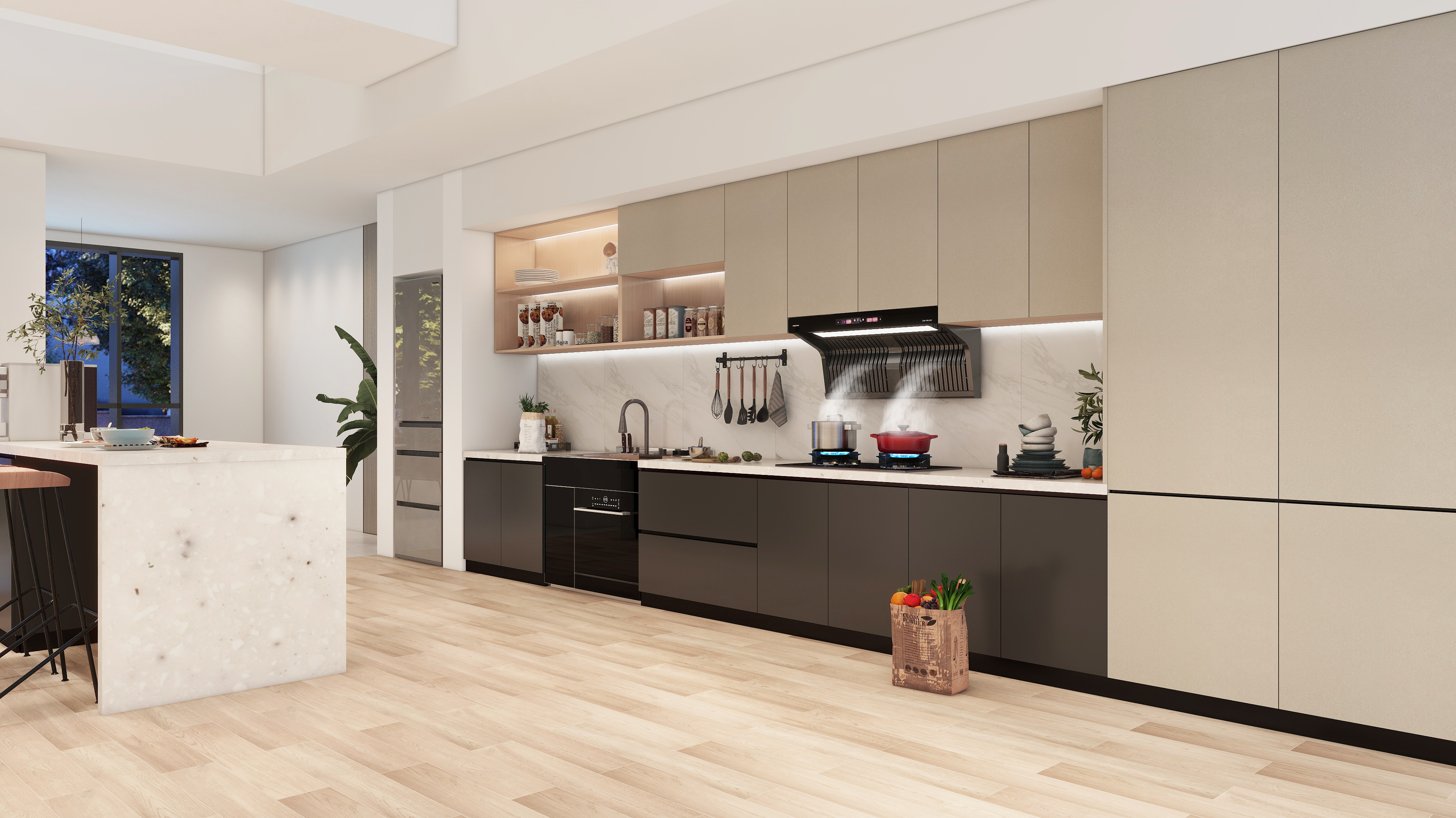 年輕一代都偏愛,半開放式及開放式廚房。一是考慮到美觀度,還有一個就是陪伴!相對于老一代悶聲在廚房烹飪,年輕一代更喜歡在烹飪的時候與家人、朋友一起聊聊天。在這種新生的趨勢中,人們對廚房的期待,已經不僅是為了忙活出一頓飯。