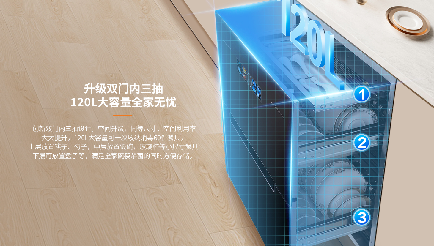 隱藏式拉手,平嵌設(shè)計(jì),不占空間防磕碰,提升廚房空間利用率。上層紫外線(xiàn)輕消毒,精準(zhǔn)殺滅表面細(xì)菌,下層遠(yuǎn)紅外高溫滅菌,消滅99.99%常見(jiàn)病菌。遇上回南天也不用擔(dān)心,保持餐具干爽又清新,守護(hù)全家的健康安全!
