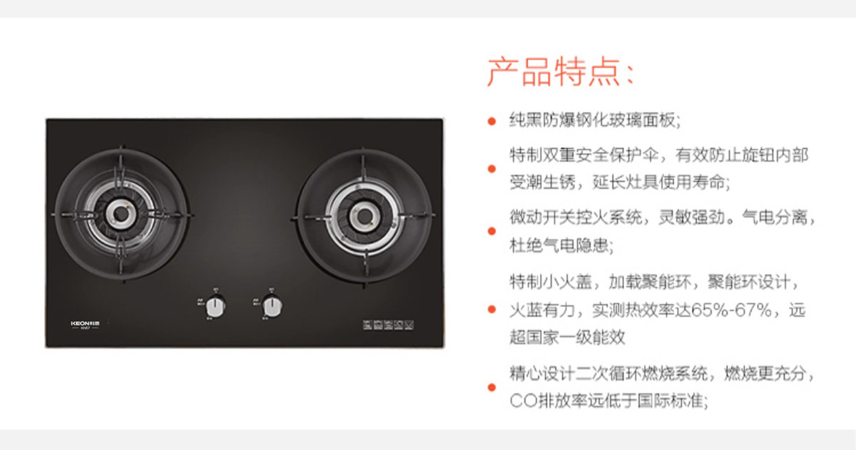 - 特制小火蓋,火藍有力,熱效率達65%-67%,高于一級能效標準。