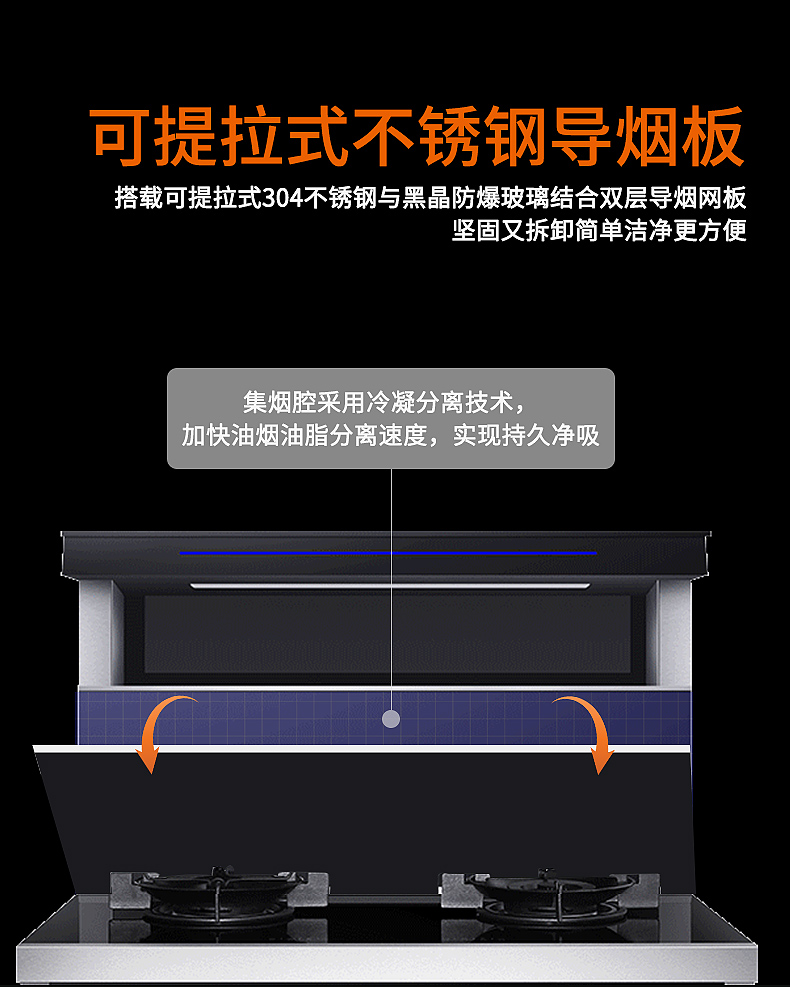 • 集煙腔采用冷凝分離技術,加快油煙分離速度,實現持久凈吸。