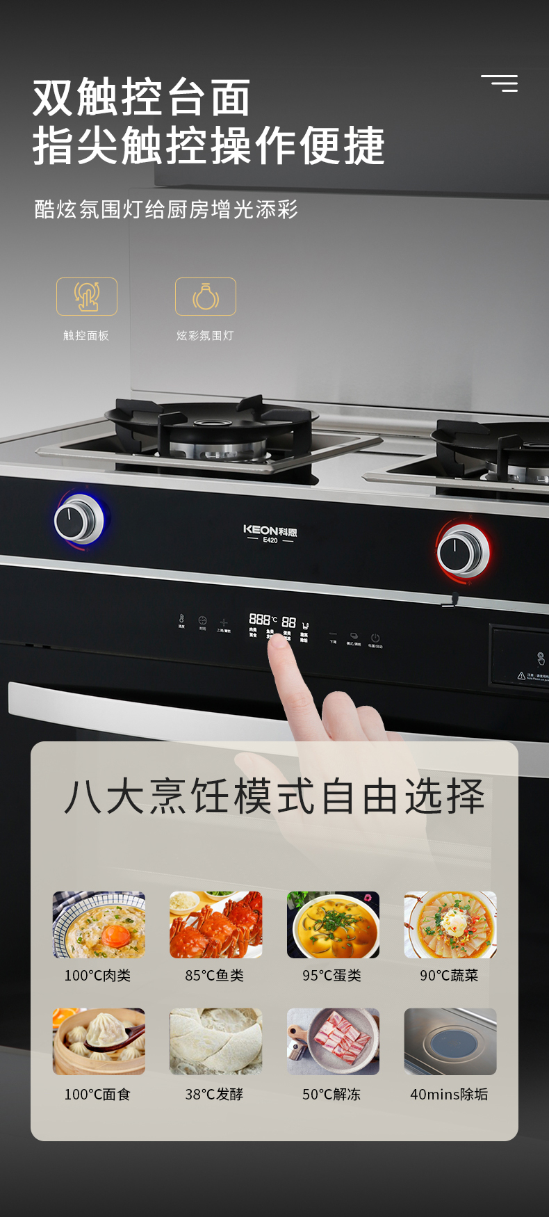 • 語音喚醒,智能鮮蒸,科恩E420智能語音集成灶