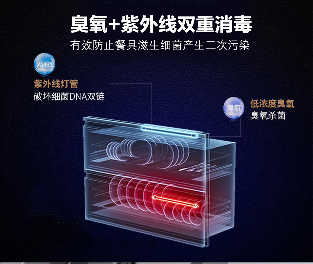 - 臭氧+紫外線雙重消毒設計,有效防止餐具滋生細菌產生二次污染等風險
