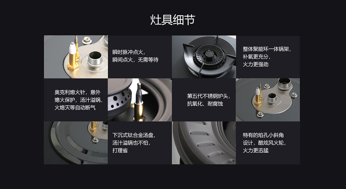 • 不銹鋼一體火蓋,表面耐高溫瓷膜涂層工藝