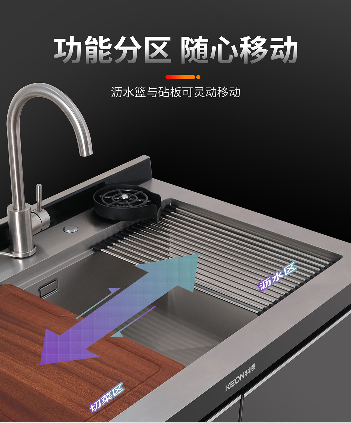• 瀝水籃與砧板可靈動移動,功能分區(qū),隨心移動