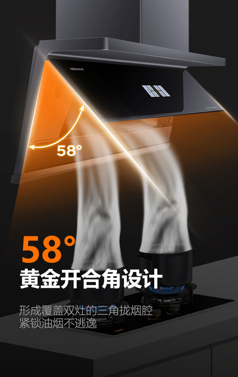 采用58°黃金開合角,緊鎖油煙不逃逸